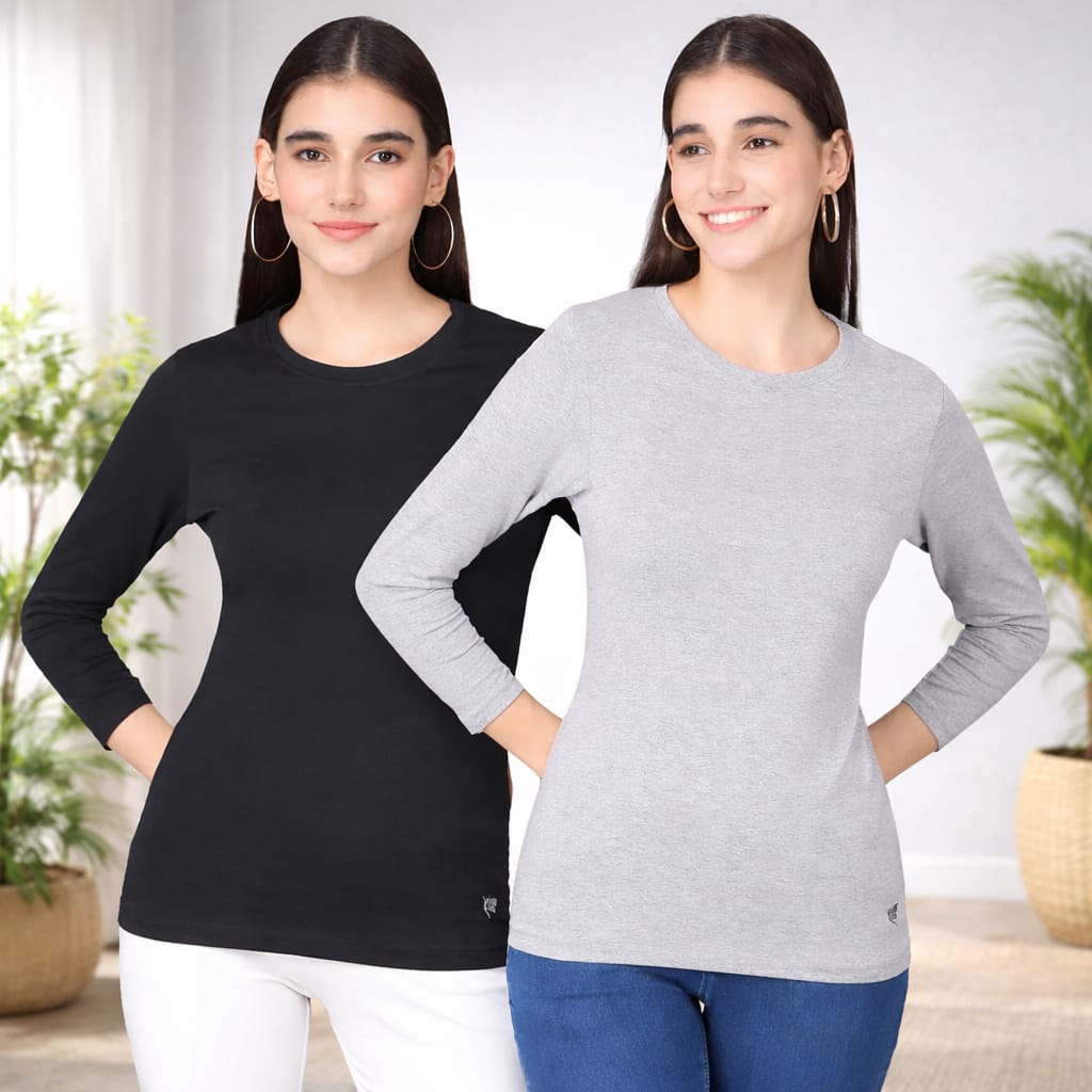 Comfort Lady Regular Fit Round Neck Plain Full Sleeve T-Shirt pack of 2